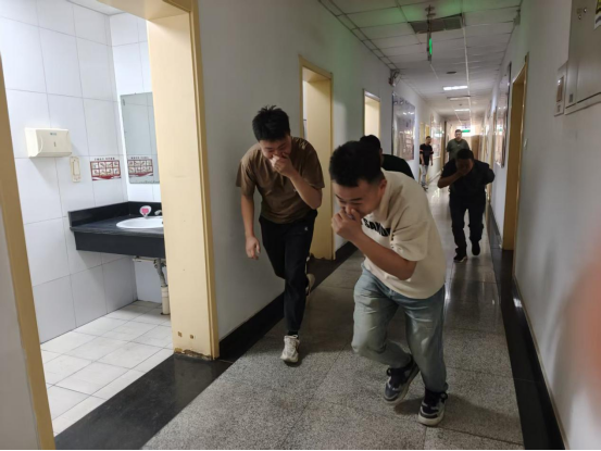 16点51分,应急小分队身穿消防服,背着呼吸器,手提灭火器、水带,直奔实验动物中心楼一层会议室楼救火。楼内学生陆续疏散出来,聚集在广场,疏散引导组组织楼内师生沿安全通道有序撤离。