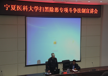 2018年11月30日,学校邀请银川市公安局陈全宁警官来校为师生开展扫黑除恶专项斗争法制宣讲,向师生介绍了社会上黑恶势力的各种表现形式、如何识别黑恶势力、涉黑涉恶违法犯罪线索举报方式等。此次讲座增强师生远离黑恶、预防犯罪、遵纪守法的意识,不断推进了太阳成平安校园的建设发展。学校师生代表近200名聆听了讲座。