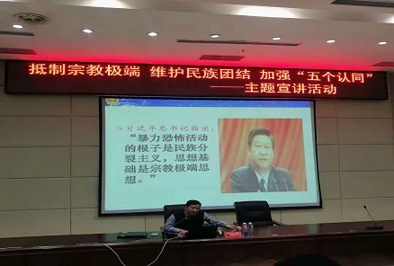 2018年11月30日,新疆警察学院非传统安全研究所主任、公安部特邀讲师张昆教授在雁湖校区正德楼第二会议室为师生做了“抵制宗教极端,维护民族团结,加强五个认同”专题讲座。此次专题辅导,主题鲜明,内涵丰富,语言生动,针对性强,讲座既有理论深度,又紧密联系实际,必将指导帮助师生树立正确的马克思主义民族观宗教观。