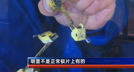 墟插线板被烧得只剩下铜片,调查员清洗后,发现上面有两个小洞,明显不是正常极片上应有的。