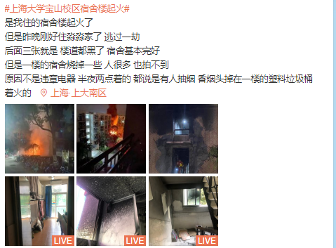 有网友发微博称:"上海大学宝山校区宿舍楼起火,但是昨晚刚好住在朋友家了,逃过一劫。",微博中还写道,起火原因疑似“有人抽烟,烟头掉在一楼塑料垃圾桶上着火的”