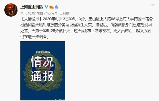 上午10点左右,@上海宝山消防 发布火情通报:“9月13日03时13分,宝山区上大路98号上海大学南区一宿舍楼西侧露天临时堆放的分类垃圾桶发生火灾。接警后,消防救援部门迅速赴现场处置,火势于03时25分被扑灭,过火面积5平方米左右,无人员伤亡,起火原因仍在进一步调查。”