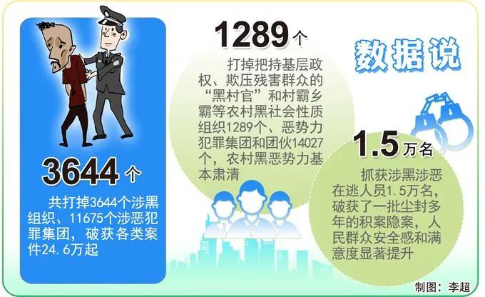 扫黑除恶斗争中,公安机关从解决群众最忧心、最期盼、最急迫的问题入手,有黑扫黑、有恶除恶、有乱治乱,共打掉涉黑组织3644个、涉恶犯罪集团11675个,破获各类案件24.6万起;打掉把持基层政权、欺压残害群众的“黑村官”和村霸乡霸等农村黑社会性质组织1289个、恶势力犯罪集团和团伙14027个,农村黑恶势力基本肃清;抓获涉黑涉恶在逃人员1.5万名,破获了一批尘封多年的积案隐案,人民群众安全感和满意度显著提升。