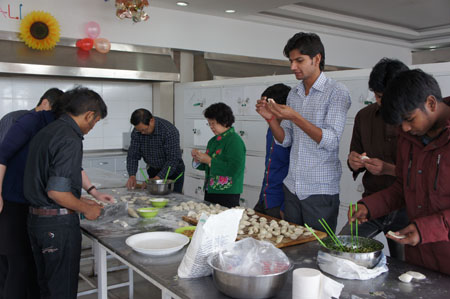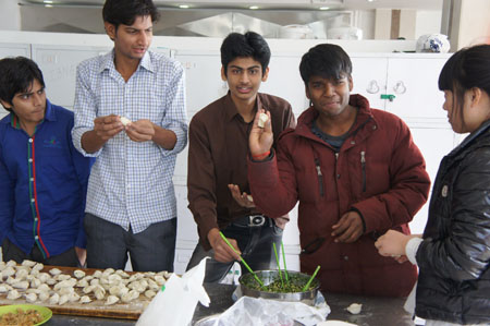 俗话说“好吃不过饺子”。春节吃饺子是中国人的传统习俗。为了能让留学生们感受中国味儿,农历大年初四,田淑卿副书记和学校相关部门负责人与留学生一同包饺子过春节,并向他们送上春节的问候,希望他们在学校度过一个欢乐祥和的新春佳节。 经过精心布置的留学生餐厅充满了浓浓的年味,留学生们也精心准备了具有印度特色的美食,并向校领导们祝贺春节快乐。大家在一起吃饺子、品尝印度美食,相互送上新年祝福,共度中国传统佳节。