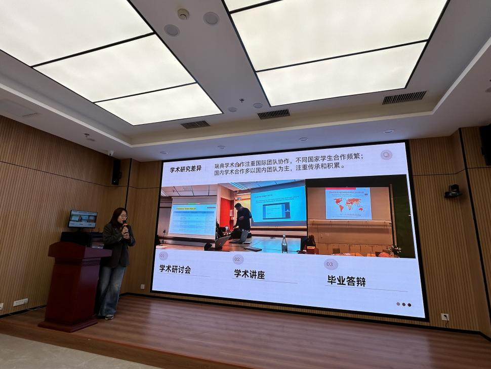 此次活动是研究生党支部精心打造的特色品牌项目,旨在构建“党建引领、学术交流、创新实践”三位一体的学术平台。活动邀请赴瑞典隆德访学交流的三位研究生围绕访学交流成果作相关主题报告及交流讨论。唐芸以《瑞典隆德大学 CRC 交流项目学习与生活体验汇报》为题,围绕科研和生活等多个方面深入分享在科研道路上的经验和心得。李依蔓作主题为《从北极光到咖啡文化:瑞典与国内学习生活的101个反差》的分享报告,聚焦自然风景差异、异国文化差异、学术交流差异等内容介绍个人成长的心路历程。王毓雯作《在瑞典的三个月我竟变成了“六边形战士”》主题分享,通过讲述出国访学遇到的挫折与困难,鼓励与会党员要始终保持对科学的热爱和敬畏之心,勇于探索未知领域,敢于突破自我极限。