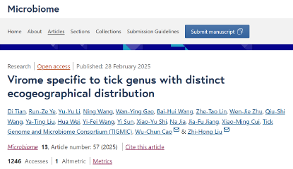 2025年2月28日,我院曹务春/刘志宏课题组在Microbiome期刊(IF=13.8,中科院一区,Top文章)发表了题为Virome specific to tick genus with distinct ecogeographical distribution的研究论文,揭示了蜱的病毒群落受生态地理因素影响显著,不同蜱属携带的病毒具有较强的属特异性。