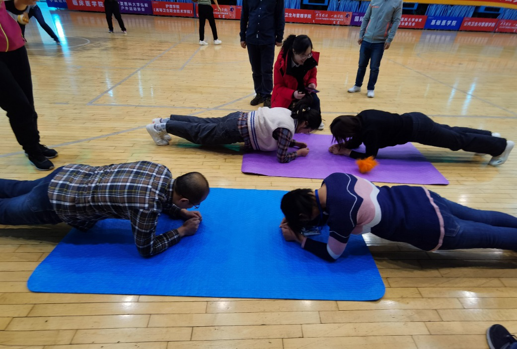 趣味篮球赛中,男、女老师自由组队,配合由生疏到默契,虽然打地很辛苦,但收获了汗水和无尽的欢笑声;夹球跑,考验的不止是参赛人员的速度,还有平衡、耐心和配合;最后,全体人员参加的平板支撑大比拼将本次活动推向高潮,马文智老师以4分13秒摘得桂冠。