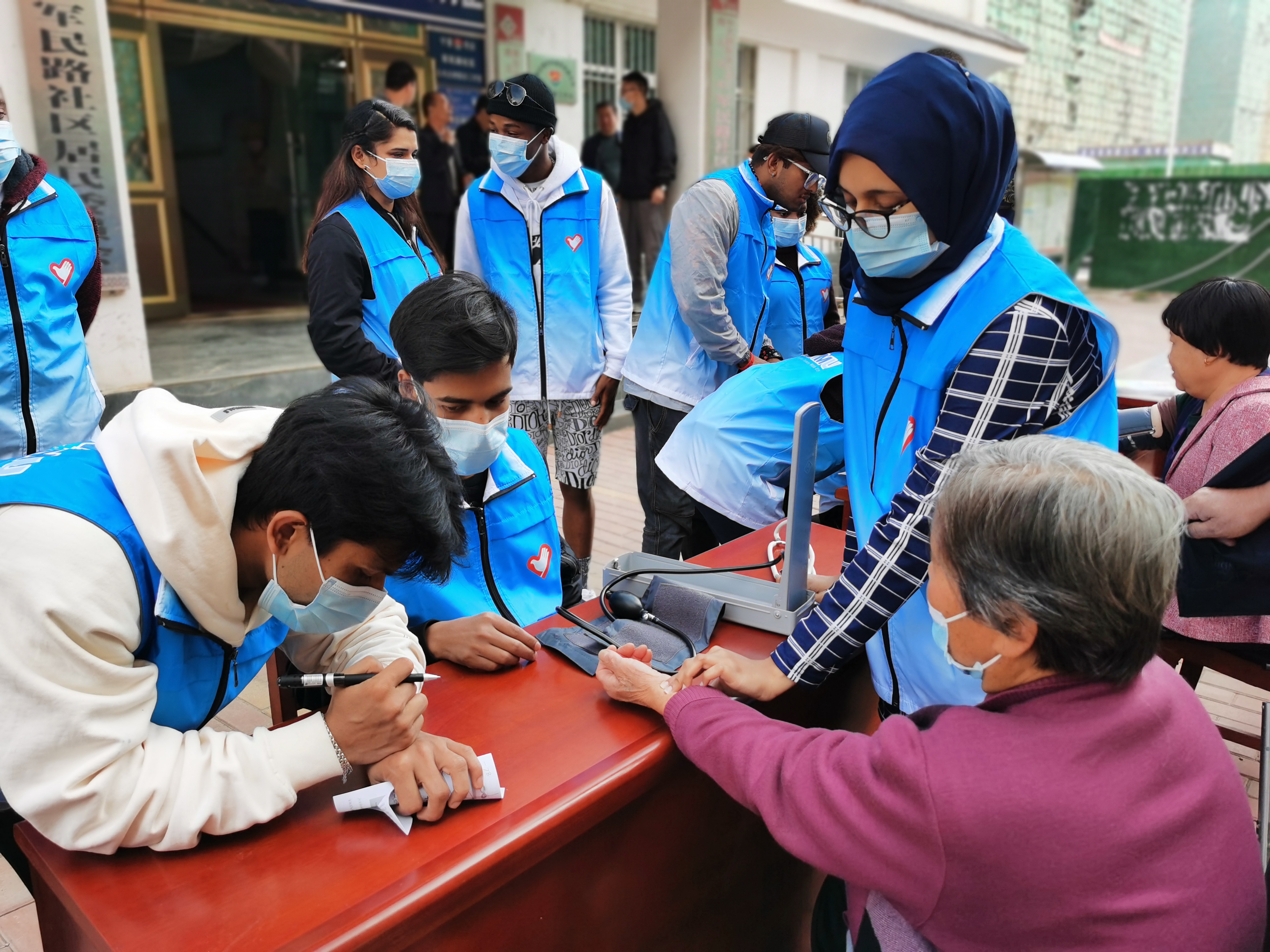 10月2日,由19名留学生和3名中国学生组成的“太阳成集团官方网站留学生中西医健康服务义诊团”,在固原市原州区碧水兰庭社区开展了社区义诊服务活动。社区居民们早早排起长龙,都想请这些他们眼中有着不同颜色皮肤却非常专业的外国医学生们为自己进行测量血压、心脏听诊问询等健康咨询和健康推拿等中医服务。