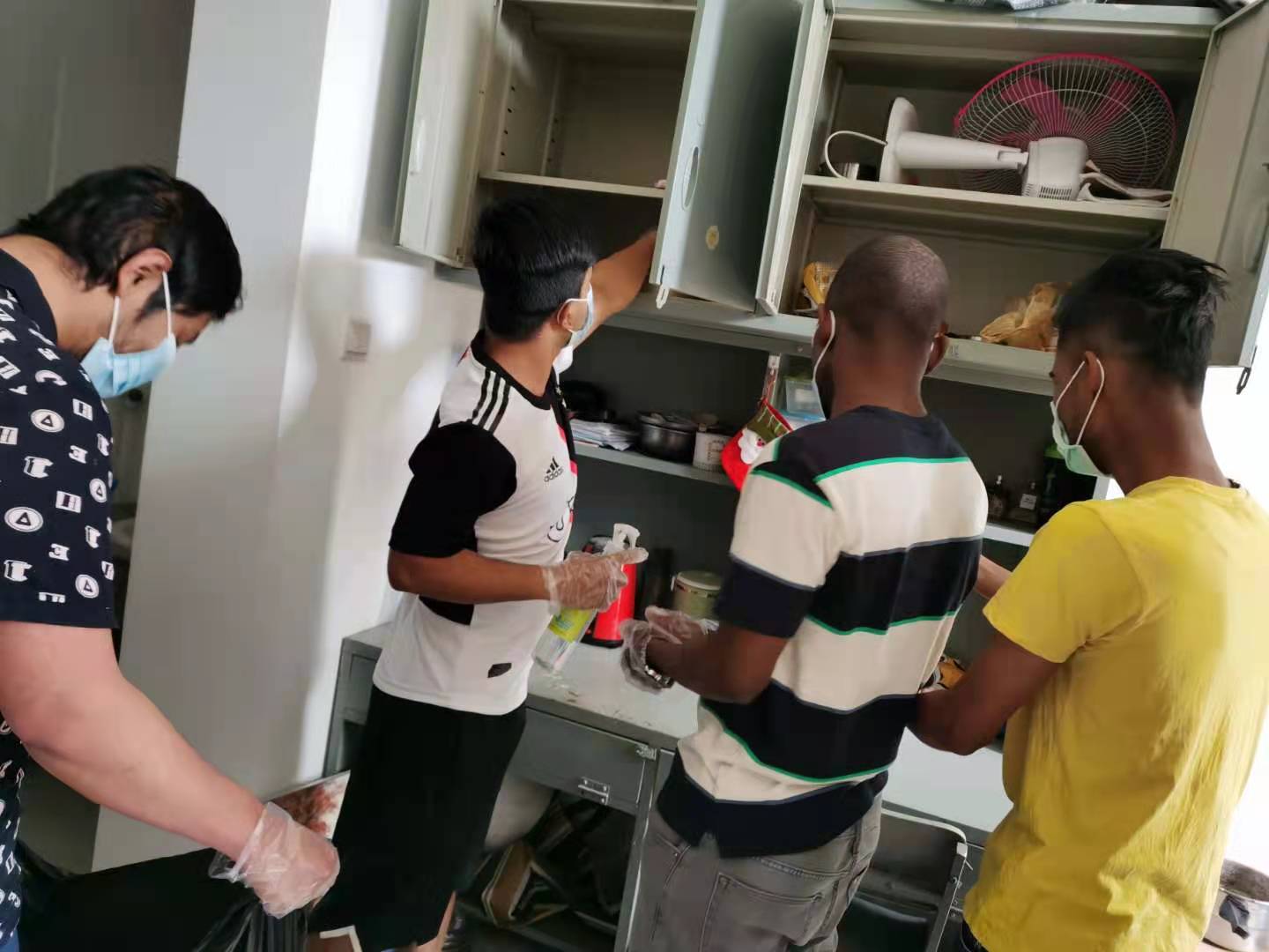国际教育学院全体在校师生同时为雁湖、双怡校区境外留学生,打开宿舍开窗通风,清理冰箱杂物,清理滞留宿舍的垃圾,检查宿舍安全等,既确保安全的生活环境,又让海外留学生体会到学院师生的关心和关注。