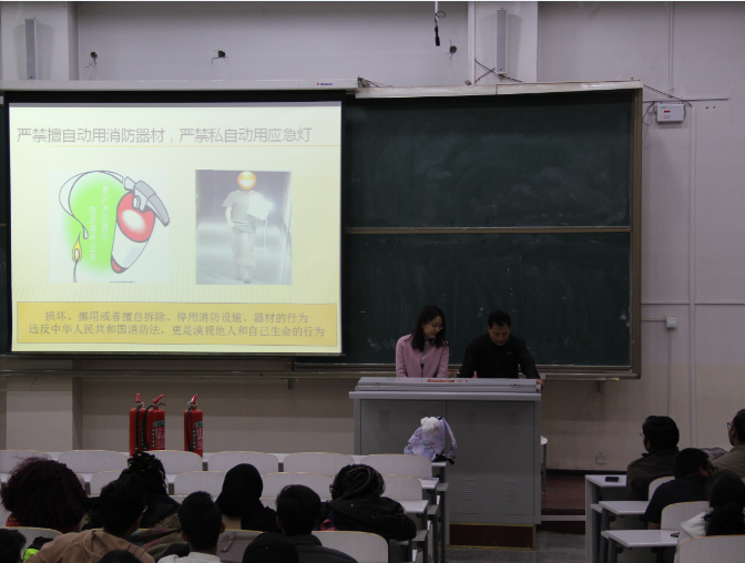 本次教育活动包括消防安全知识培训和安全演练两部分,主要目的是教会留学生如何正确使用消防器材,以及掌握火宅发生后的扑救、逃生方法。本次活动邀请了保卫处杨俊康老师为留学生开展消防安全知识培训。杨老师从校园日常消防安全,到火灾发生后的基本扑救方法、火灾中自救及灭火器的正确使用方法等为大家进行了一一讲解,从而让学生们了解并掌握了正确的防火和逃生知识。他希望同学们通过此次消防安全知识培训,能够增强消防意识,保障人身安全,为创建安全和谐校园奉献力量。