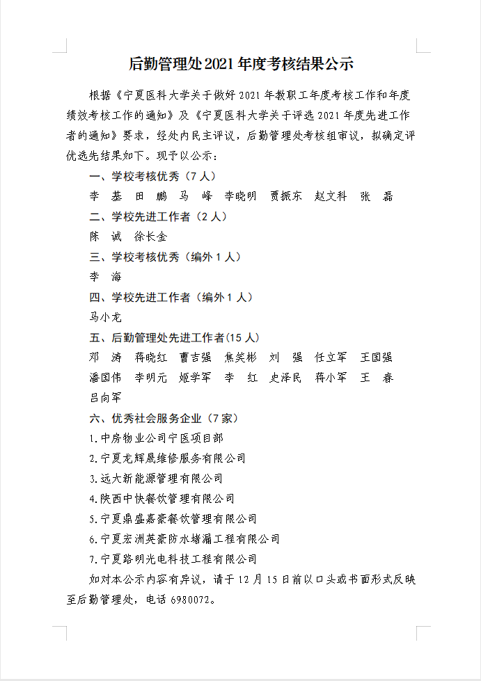 后勤管理处2021年度考核结果公示