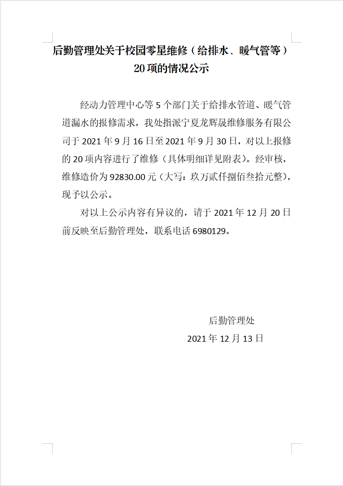 后勤管理处关于校园零星维修(给排水、暖气管等)20项的情况公示