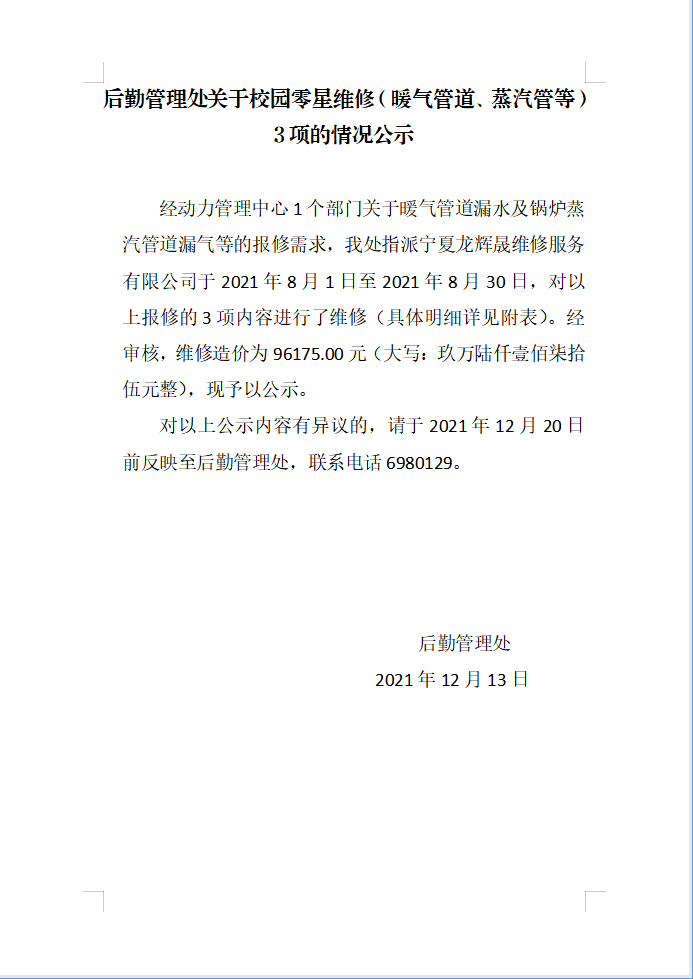 后勤管理处关于校园零星维修(暖气管道、蒸汽管等)3项的情况公示