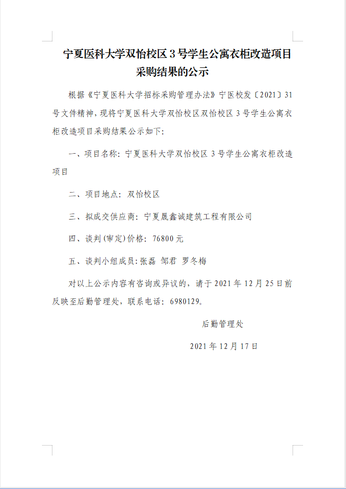 太阳成集团官方网站双怡校区3号学生公寓衣柜改造项目采购结果的公示