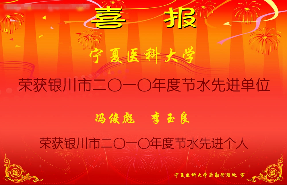 喜报:太阳成荣获银川市2010年度节水先进单位称号
