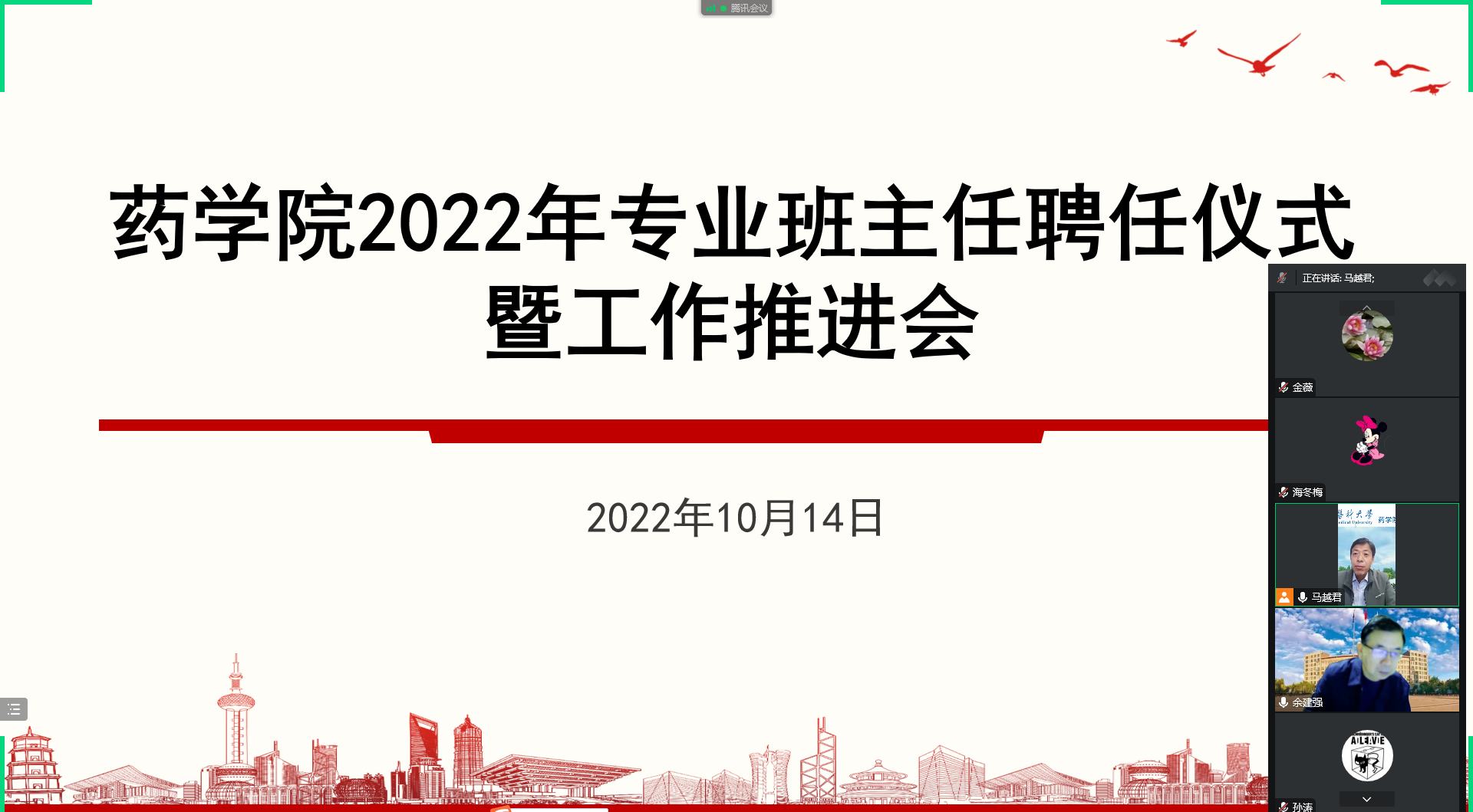 10月14日晚上,药学院通过腾讯会议召开2022年专业班主任聘任仪式暨工作推进会,学院党委书记孙冬梅、执行院长余建强、专业班主任以及辅导员参加会议,会议由学院党委副书记马越君主持。会上,孙冬梅宣读了《药学...