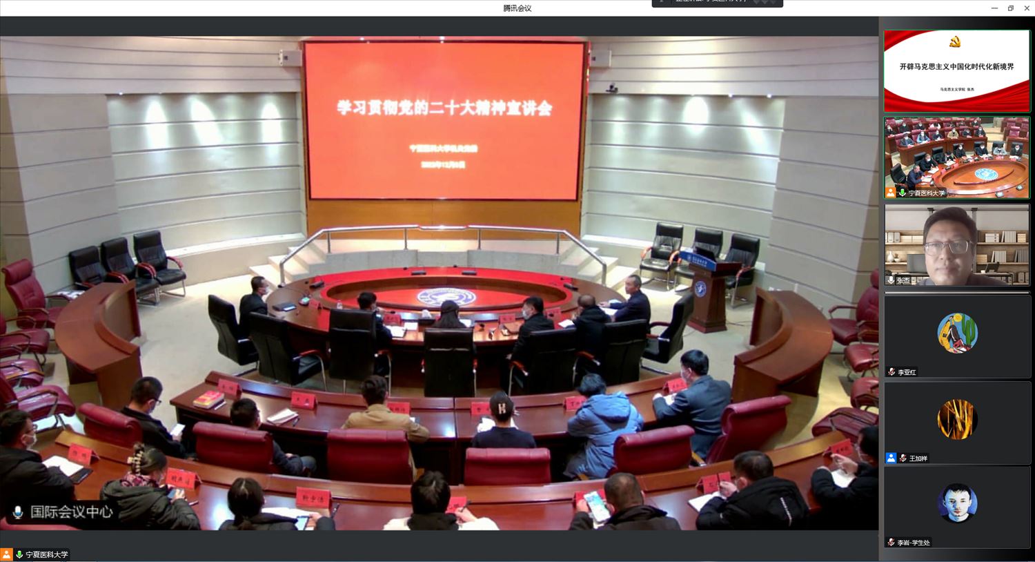 12月14日,根据《学校党委关于学习宣传贯彻党的二十大精神宣讲工作方案》安排,马克思主义学院副院长何佳洁副教授为中医学院、药学院、宁夏少数民族医药现代化教育部重点实验室和附属中医医院作党的二十大精神专...