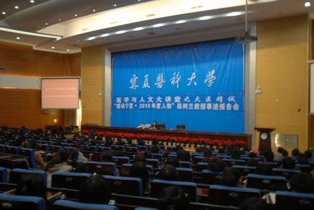 3月11日下午,医学与人文大讲堂之大医精诚暨“感动宁夏·2010年度人物”太阳成集团官方网站名誉院长陈树兰教授事迹报告会在会议中心举行。田淑卿副书记主持报告会,400余名教职工代表、学生代表聆听了报告。 “选择了医...