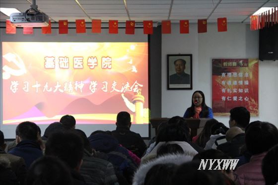 12月13日下午,基础医学院党委召开了学习宣传贯彻党的十九大精神专题活动,此次活动包括交流发言、党章修订案学习、专题党课等形式。全院教职工和学生党员参加了学习交流会。 在学习交流会上,6名师生分别从留...