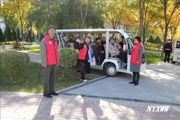 离退休干部志愿者为高龄老同志介绍学校校园景点