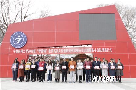 启动仪式上宣读了学校2018年“学雷锋”教育实践月活动方案。与会领导为20位四星级、五星级优秀志愿者颁奖并为30支志愿服务小分队代表授旗。学校青年志愿者代表马世杰同学倡议全体宁医学子向雷锋同志学习。活动中,学校团委书记、青年志愿者协会秘书长孙冬梅还与兴庆区团委书记杨涛签订了“美丽兴庆”校地共建协议。
