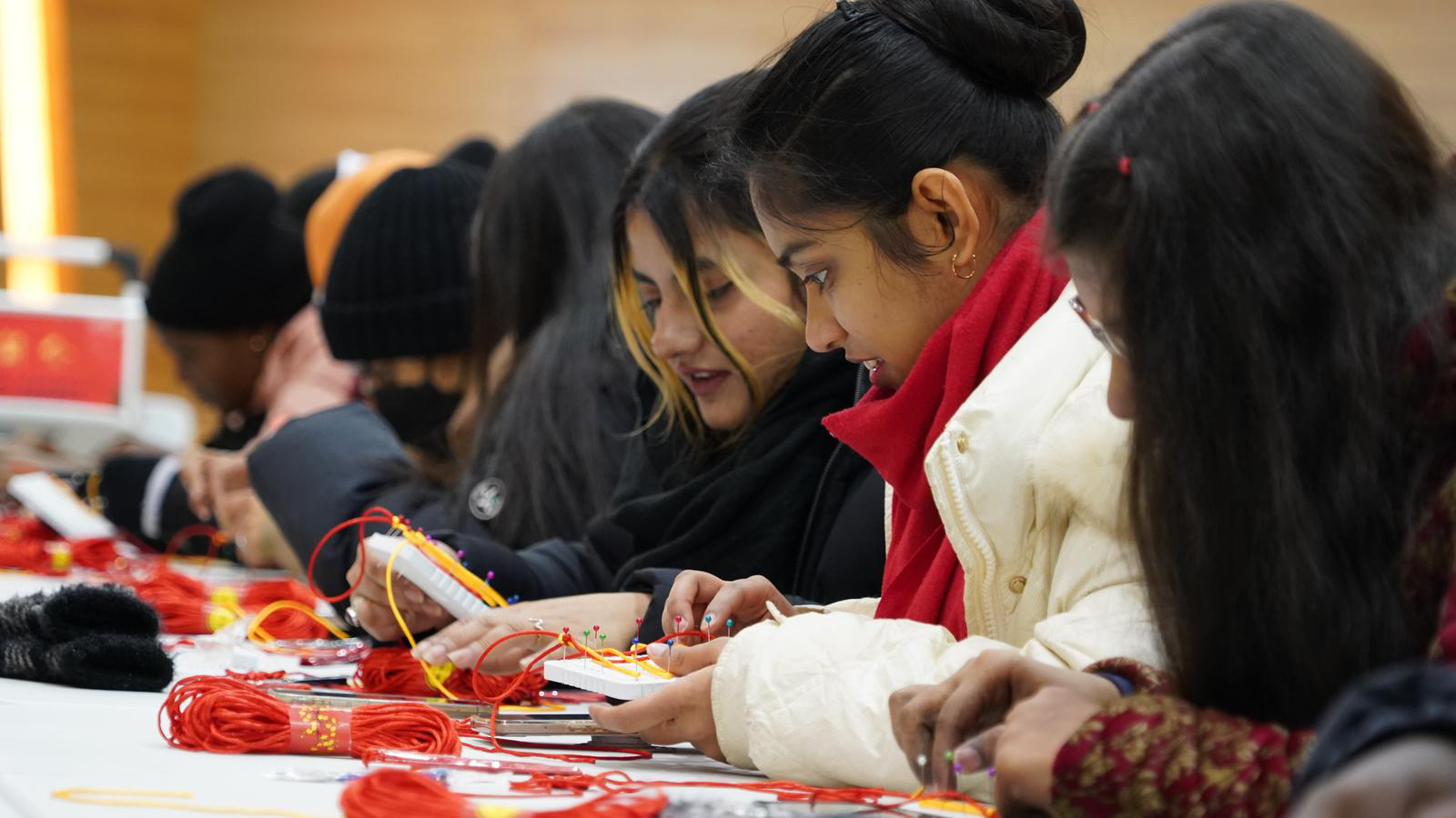 在银川世界岩画馆,留学生们兴致勃勃地参观了各个展区,通过讲解和VR体验,在古老的岩画中追寻历史的足迹。在馆里的活动中心,大家一起饶有兴趣地体验了中国结的制作技艺,沉浸在传统手工制作的乐趣中。来自斐济的留学生伊芙琳目不转睛地观看老师的制作演示,边学边做,尽管有些生疏,但她说中国结太好看了,一定要努力做出自己的作品,当作新年礼物带回去和同学们分享。