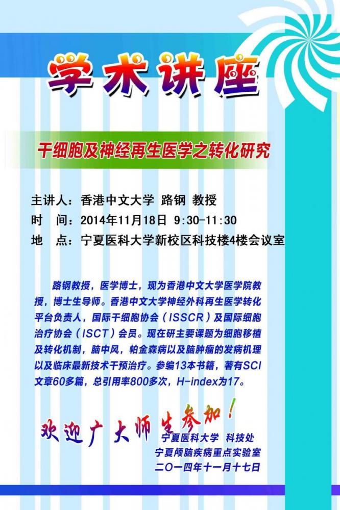 学术讲座:干细胞及神经再生医学之转化研究——路钢教授