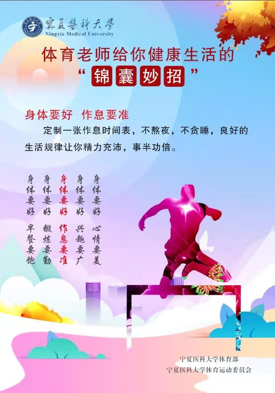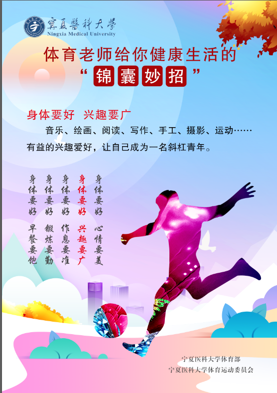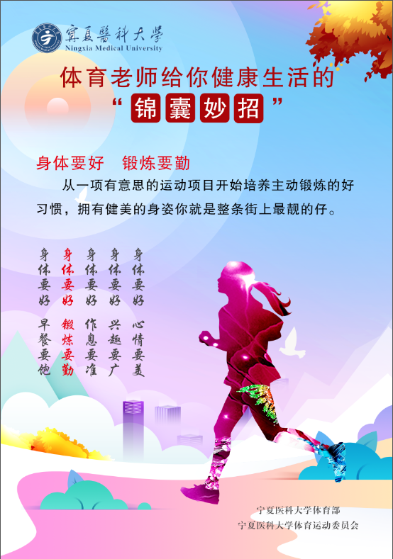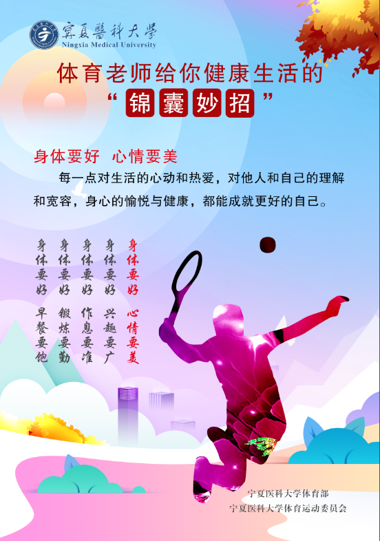 在疫情防控常态化下,为进一步强化复学复课后的校园健康教育,树立健康第一理念,培养学生良好体育卫生习惯,增强学生体质,提高健康水平和机体免疫力,实现体育与健康教育深度融合,帮助学生养成科学锻炼习惯,形成健康生活方式,学校体育部结合当前疫情防控要求及校园环境的新变化,推出“体育老师给你的健康生活‘锦囊妙招’”,为师生身心健康保驾护航。