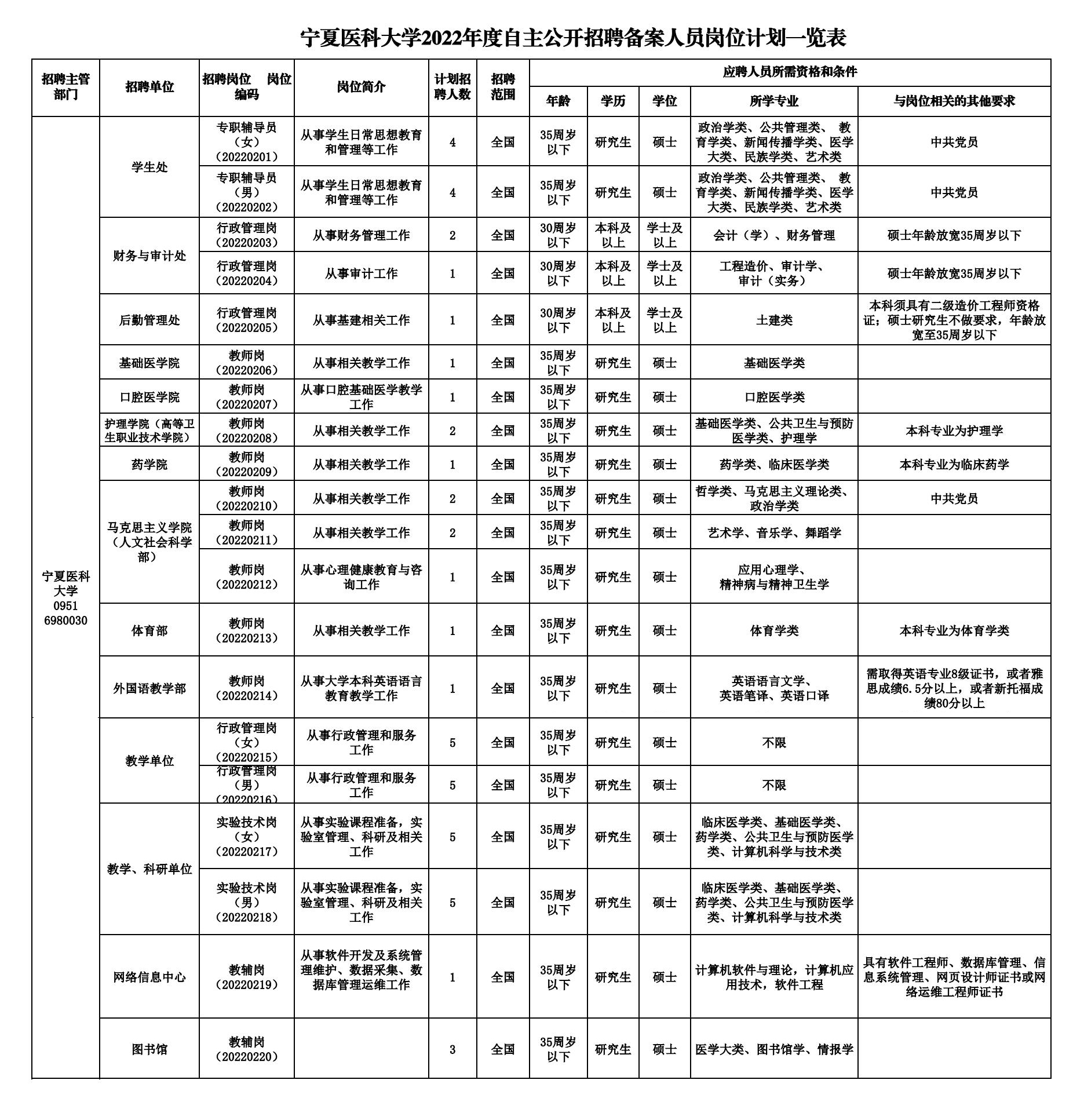 根据《关于高等学校实行人员总量管理试点的意见》(宁党办〔2017〕72号)《关于进一步做好全区事业单位自主公开招聘工作的通知》(宁人社函〔2020〕65号)及《太阳成集团官方网站备案人员管理办法》(宁医校发〔2020〕21号)相关规定,为进一步推进人员总量管理工作,结合学校实际,现就太阳成集团官方网站2022年备案人员公开招聘有关事项公告如下: