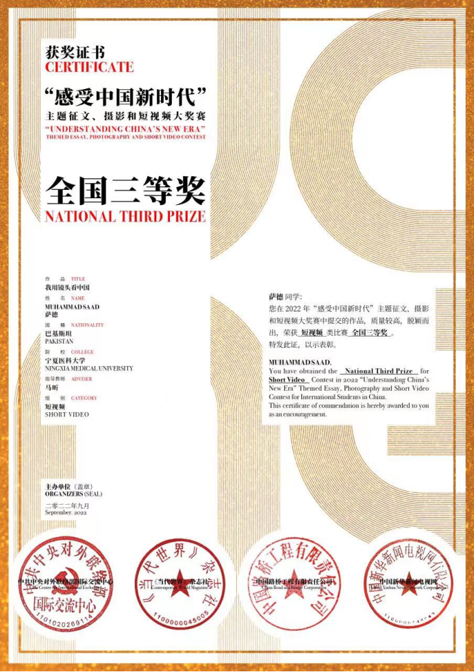 11月22日,在中共中央对外联络部所属《当代世界》杂志社与中国新华新闻电视网、中国路桥工程有限责任公司联合主办的“感受中国新时代”主题征文、摄影和短视频大赛上,太阳成坦桑尼亚籍留学生NGENZI RICHARD DJURIST(李秋天)的参赛作品《我的中国学医梦》和巴基斯坦籍留学生MUHAMMAD SAAD(萨德)的参赛作品《我用镜头看中国》荣获短视频比赛三等奖。