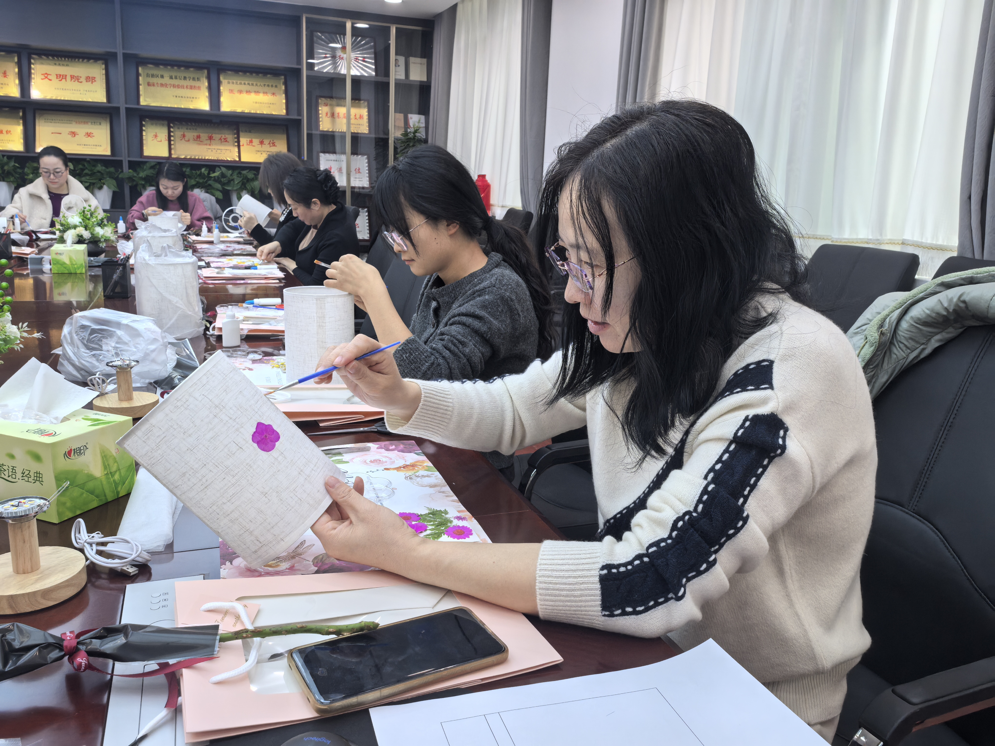 活动现场,女教职工们精神饱满,参与热情高涨,氛围温馨愉悦。在专业老师的指导下,大家各显神通,将不同形状、颜色的干花精心组合。有的以玫瑰花瓣为主,搭配几缕蕨类植物的叶片,营造出浪漫优雅的氛围;有的则运用多种小花,拼凑出充满童趣的图案。在精心的构思与审美下,一盏盏台灯逐渐成型,原本朴素的灯罩被装点得绚丽多彩,每一盏都是独一无二的手工艺术作品。女教职工们在感受美、欣赏美、创造美的过程中,相互交流创意、分享制作心得,陶冶情操。活动结束后,大家纷纷在心愿墙上表达了对未来生活的美好向往。