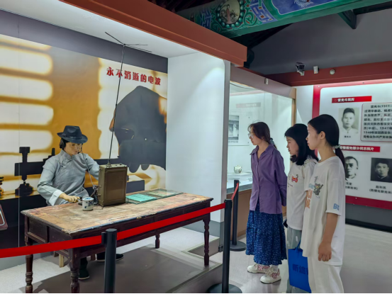 凤凰台是咸阳市区内唯一保存较完好的高台古建筑群,同时又是革命旧址,被誉为“咸阳古城明珠”。在抗战时期,凤凰台曾作为秘密电台的重要据点,无数革命志士在此以电波为武器,传递情报、坚守信仰。凤凰台展馆内斑驳的电台设备、泛黄的电文手稿,无声诉说着那段“用生命守护波长”的峥嵘岁月。实践团驻足凝视,仿佛听见滴滴答答的电报声穿越时空,与新时代青年的心跳同频共振。最后,实践团在凤凰台的夜色中重温入团誓词,让红色电波的精神在新时代继续激荡回响。