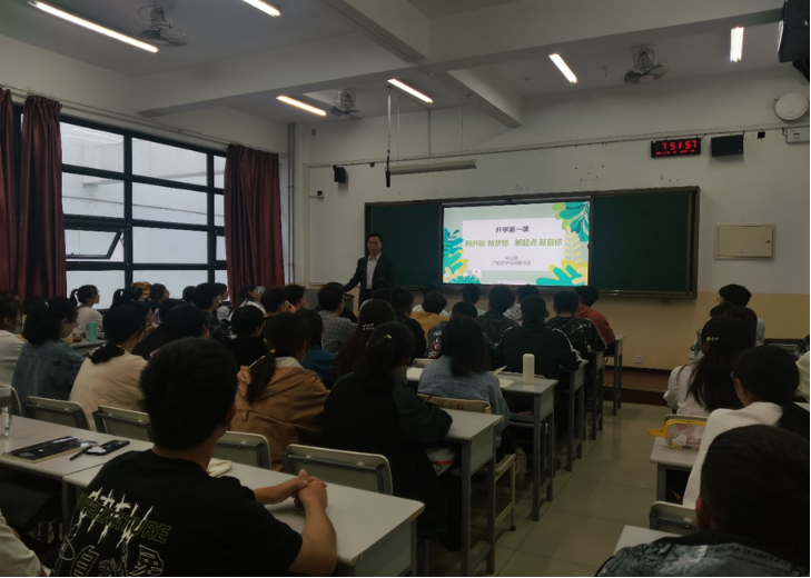 贾立勤书记以“新开始,新梦想,新起点,新目标”为主题进行了讲授,他指出同学们多年寒窗苦读,如今站在新起点,正是要准备迎接新挑战,创造新成绩的时候,同学们要深入理解“社会主义是干出来的,幸福是奋斗出来的”这一理念。
