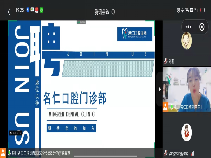 用人单位简要介绍门诊地理位置、诊室环境、服务宗旨以及擅长领域,并分别与同学们针对人才培养计划、福利体系等进行了问答性交流。此外,向大家分析介绍了相关设备更新状态,专业发展趋势和薪酬福利等事宜,同学们就最关心的培养计划和食宿问题与用人单位负责人进行了深入沟通。线上气氛热烈,秩序井然,会后,名仁口腔负责人留下联系方式,欢迎同学们致电联系,详细了解,帮助毕业生认清就业形势,拓宽就业思维和选择。