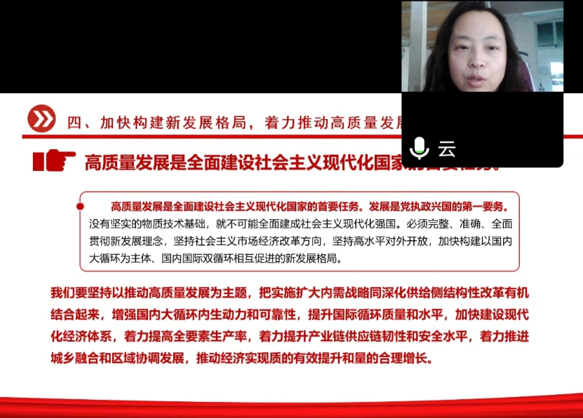 口腔医学院党委副书记王云通过腾讯会议对党的二十大报告进行了解读,内容包括过去五年的工作和新时代十年的伟大变革;开辟马克思主义中国化时代化新境界;新时代新征程中国共产党的使命任务;实施科教兴国战略,强化现代化建设人才支撑等。她希望全体党员把党的二十大精神学深研透,并运用到实践中,同时,在日常的学习生活中发挥引领作用,向同学、基层群众讲好党的故事,用同学们喜闻乐见的形式传播真理,同时传播当代青年好声音。