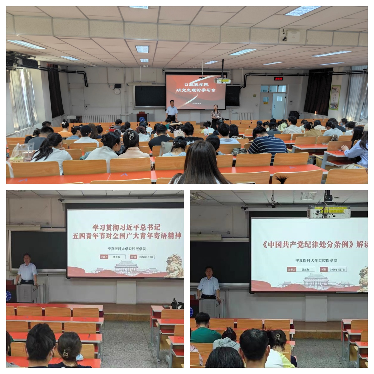 为深入学习贯彻习近平新时代中国特色社会主义思想,进一步加强研究生理论学习,扎实推进党纪学习教育, 5月7日口腔医学院组织全体研究生开展了学习会。口腔医学院党委书记贾立勤以“学习贯彻习近平总书记五四青年节对全国广大青年寄语精神”和“《中国共产党纪律处分条例》解读”为题,为同学们开展专题讲座。