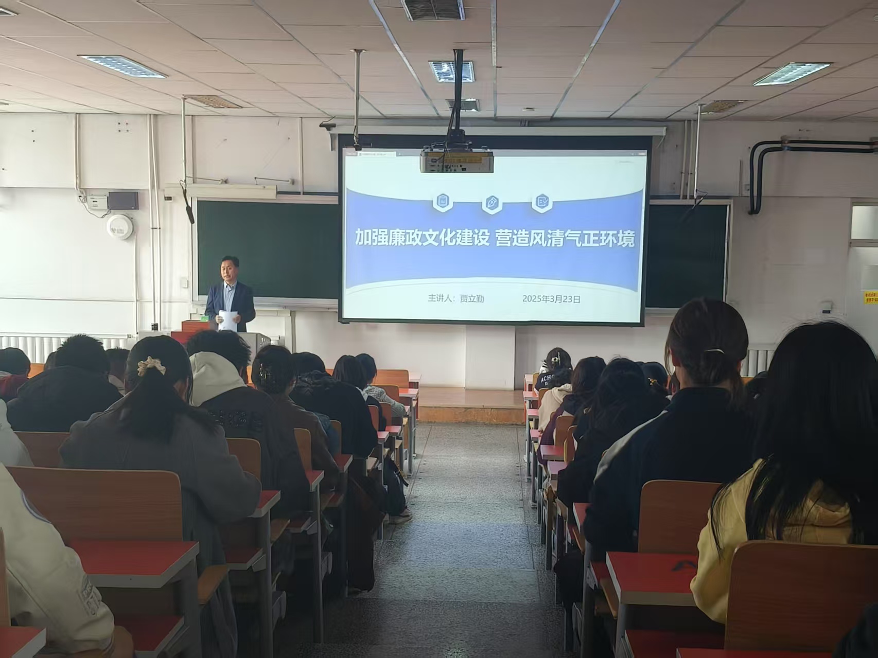 3月23日,学院党委书记贾立勤分别在双怡校区、雁湖校区为全院本专科学生做了 “加强廉政文化建设 营造风清气正环境”为主题的学生廉政教育专题讲座。