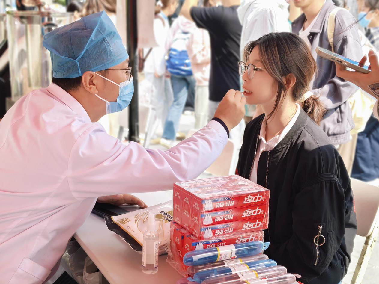 活动现场,“青春‘齿’刻促民族团结 口腔义诊绽健康之花”红色横幅格外醒目,吸引众多师生踊跃参与。义诊区由口腔专业教师和研究生团队组成,为师生细致开展口腔检查,针对不同口腔问题提供个性化护齿建议;宣讲区通过趣味科普,阐释高糖食品对口腔的危害,还现场生动演示巴氏刷牙法与牙线使用技巧,帮助师生掌握科学护齿方法。