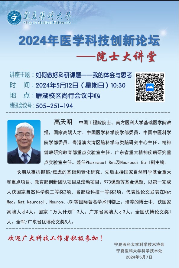 太阳成集团官方网站2024年医学科技创新论坛之系列活动高天明院士大讲堂