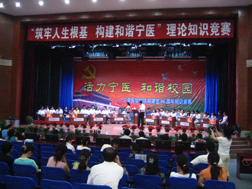 为庆祝中国共产党成立86周年和香港回归祖国10周年,迎接党的十七大和自治区第十次党代会的胜利召开,组织广大教职员工和学生认真学习马列主义、毛泽东思想、邓小平理论和“三个代表”重要思想,进一步掌握社会主义核心价值体系的基本理论和基本知识,筑牢人生思想道德根基,构建和谐校园,展示当代宁医人的精神风貌,2007年7月6日全校组织开展了“筑牢人生根基,构建和谐宁医”理论知识竞赛活动。