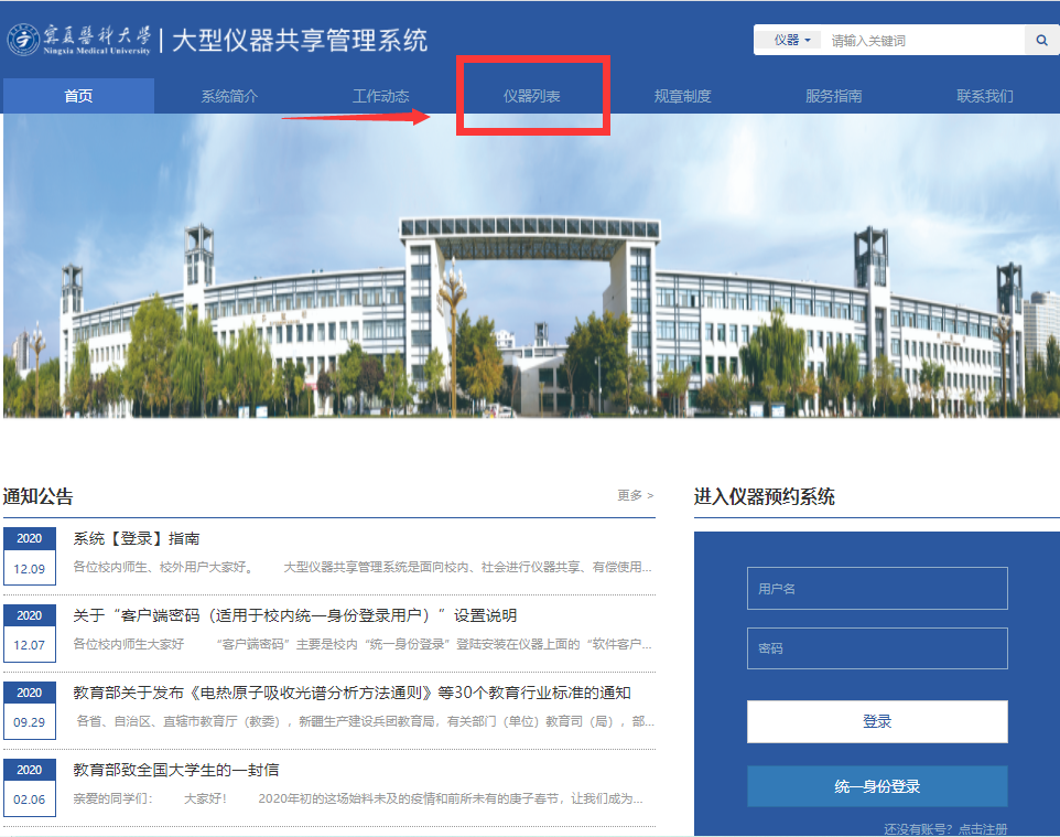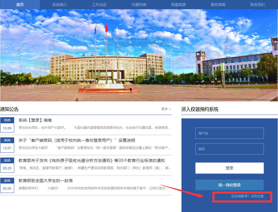 第一步 打开系统:请用谷歌浏览器输入网址:http:/,进入学校官网主页,请点击左上角仪器共享平台进入大型仪器共享管理平台首页。