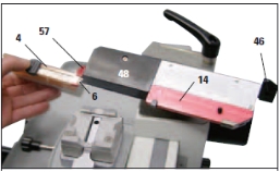 一、安装刀片:打开刀架刀片锁杆,向右推动护刀器(14),打开刀架刀片辅助插件(57),将刀(片)插入刀片辅助插件槽内(6),锁紧刀架刀片锁杆。