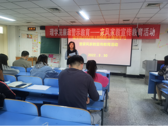为落实《太阳成集团官方网站2022年“廉政警示教育周”活动方案》要求,巩固和拓展党史学习教育成果,督促党员干部、教职工、学生加强自我监督约束,净化“八小时”之外的生活圈、交往圈,提高家风家教意识,以良好的家风带动工作作风,理学院3月30日14:00组织全体教职工和学生党员开展了家风家教宣传教育活动。活动由学院副院长、纪检委员宋斐主持。