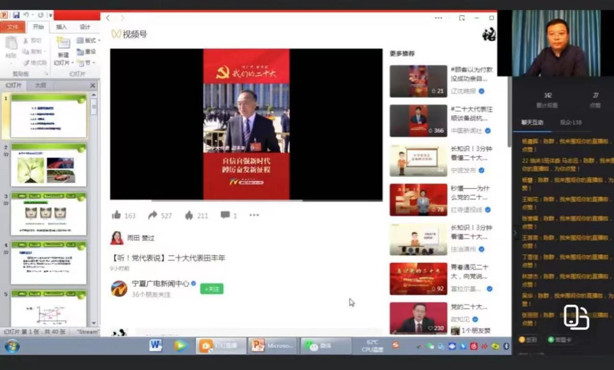 10月17日,数学教研室陈群教授在高等数学课堂上为同学们播放了宁夏广电新闻中心“我们党的二十大”中党的二十大代表田丰年书记采访的视频,展示了我们身边代表的风采和担当,激发了同学们爱党、爱国、爱宁医的热情,更加促进了同学们学习党的二十大精神的积极性,润物无声地感受到了思想教育。