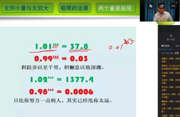 在课堂上,讲解第一章“函数、极限与连续”第二节“函数极限”时,通过幂指函数形象地向同学们讲解了每天努力一点点和每天退步一点点的差别,在第二章“一元函数微分学”第一节“导数的概念”引入“中国速度”向同学们展现了“中国骄傲”和祖国的发展,润物细无声地将课程思政贯穿在课程中。
