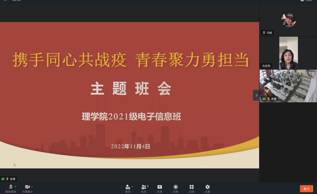 为进一步加强处级干部与学生班级的联系,扎实做好 学生的教育管理服务工作,11月4日下午,理学院党总支书记白启钧深入联系班级2021级电子信息班参加“携手同心共战疫 青春聚力勇担当”主题班会。