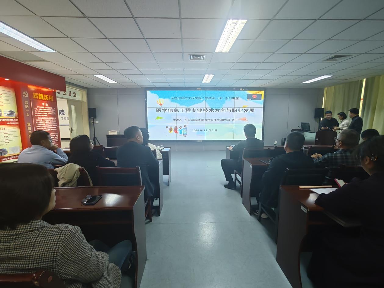 学院邀请2024级医学信息工程班学生家长—中国科学院大学计算机应用学硕士刘平先生以“医学信息工程技术方向及职业发展前景”为题展开讲座,其内容涵盖了对于医学信息工程专业的定义,专业方向理解,计算机视觉、大数据、人工智能领域的一系列原理和应用,为同学们未来发展提出多方面建议和指导,并通过具体实例向教师及学生展示本专业的发展前景及重要应用场所,使得教师及学生有更深的了解,并及时掌握相关专业的动向。