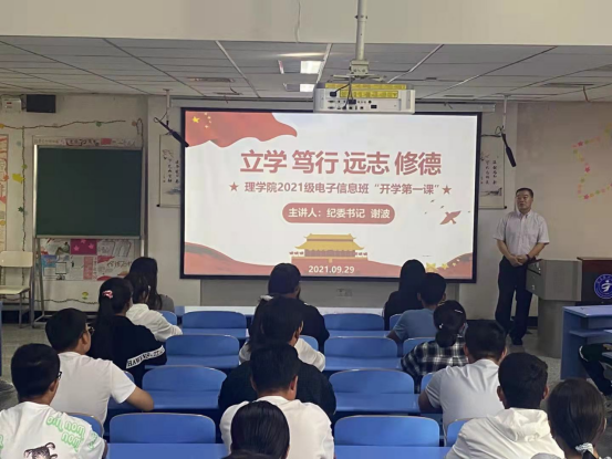 9月29日下午,学校纪委书记谢波以《立学 笃行 远志 修德——做新时代的大学生》为题,在雁湖校区厚生楼201教室为理学院2021级电子信息班全体同学讲授了一场生动的开学第一课。