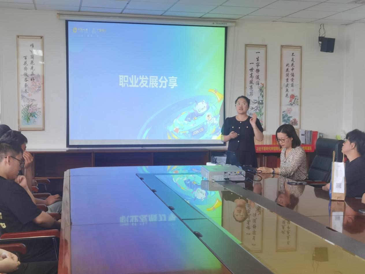 陈经理向同学们介绍了集团概况、人员需求及职业发展方向。营销经理吴敏敏分享了自己成长的经历。现场气氛活跃,同学们认真聆听宣讲,积极参与互动,主动了解企业情况。
