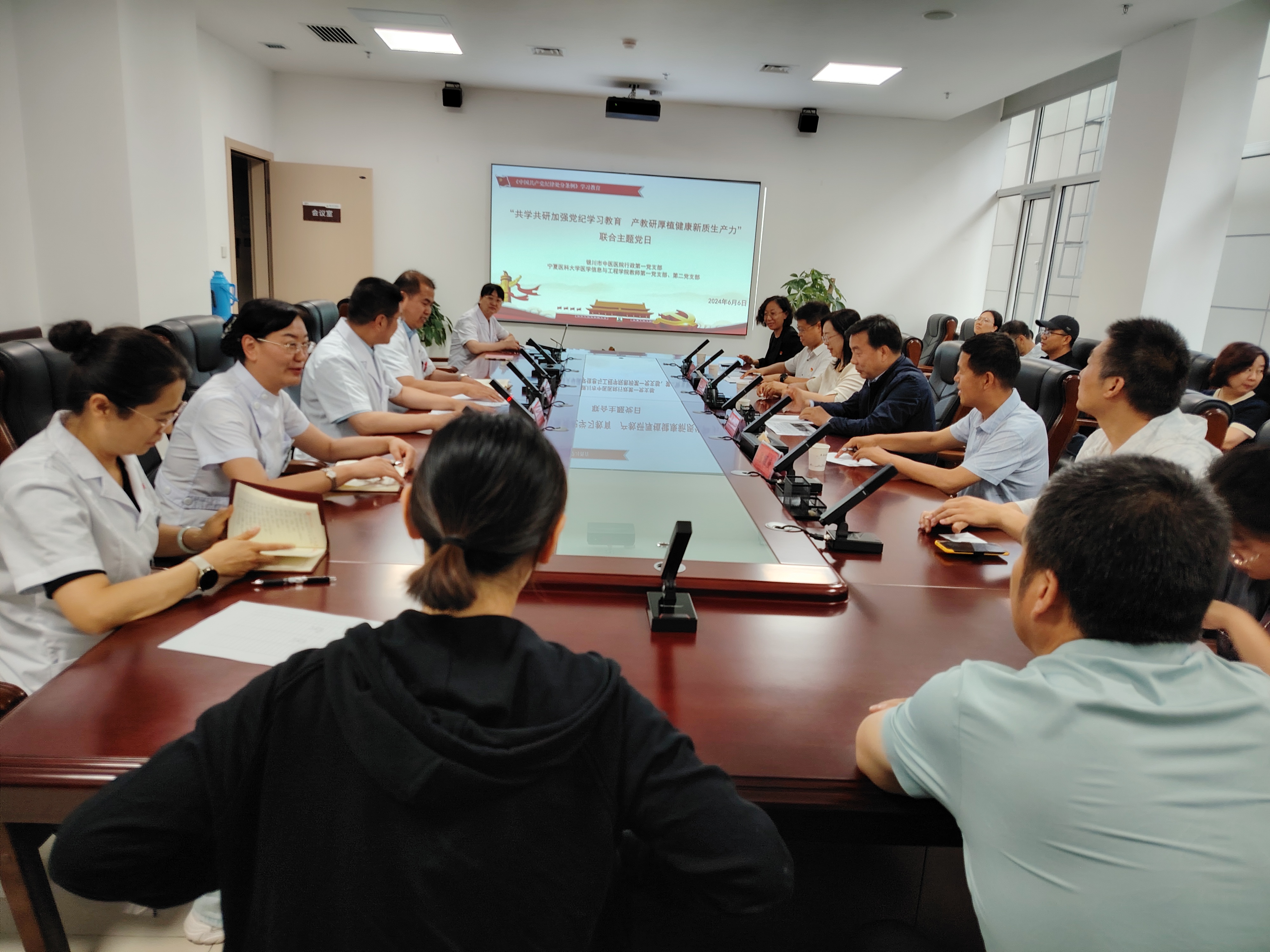 6月6日,医学信息与工程学院教师第一党支部、第二党支部的全体党员赴银川市中医医院(银川市金凤院区)与银川市中医医院行政第一党支部联合开展“共学共研加强党纪学习教育 产教研厚植健康新质生产力”主题党日活动。医学信息与工程学院计算机专业教研室教师,中医药信息学专业硕士研究生参加活动。